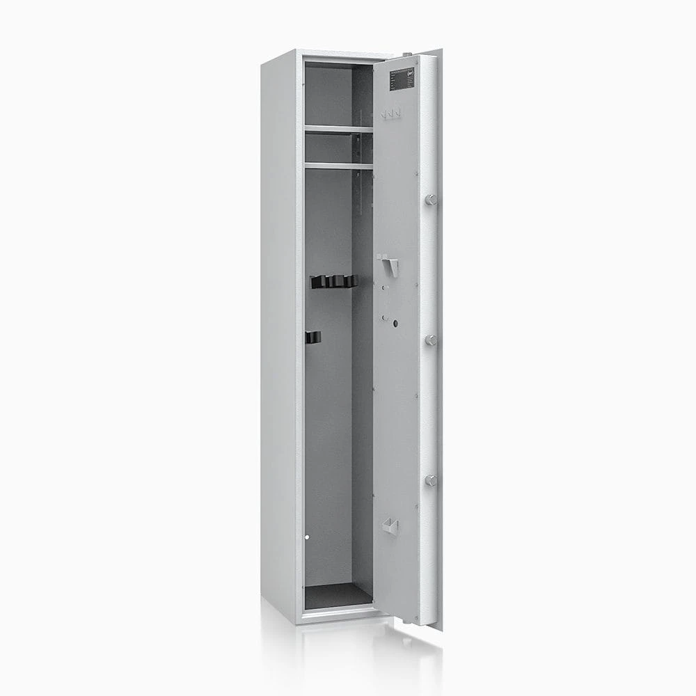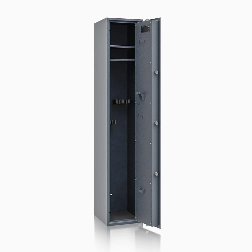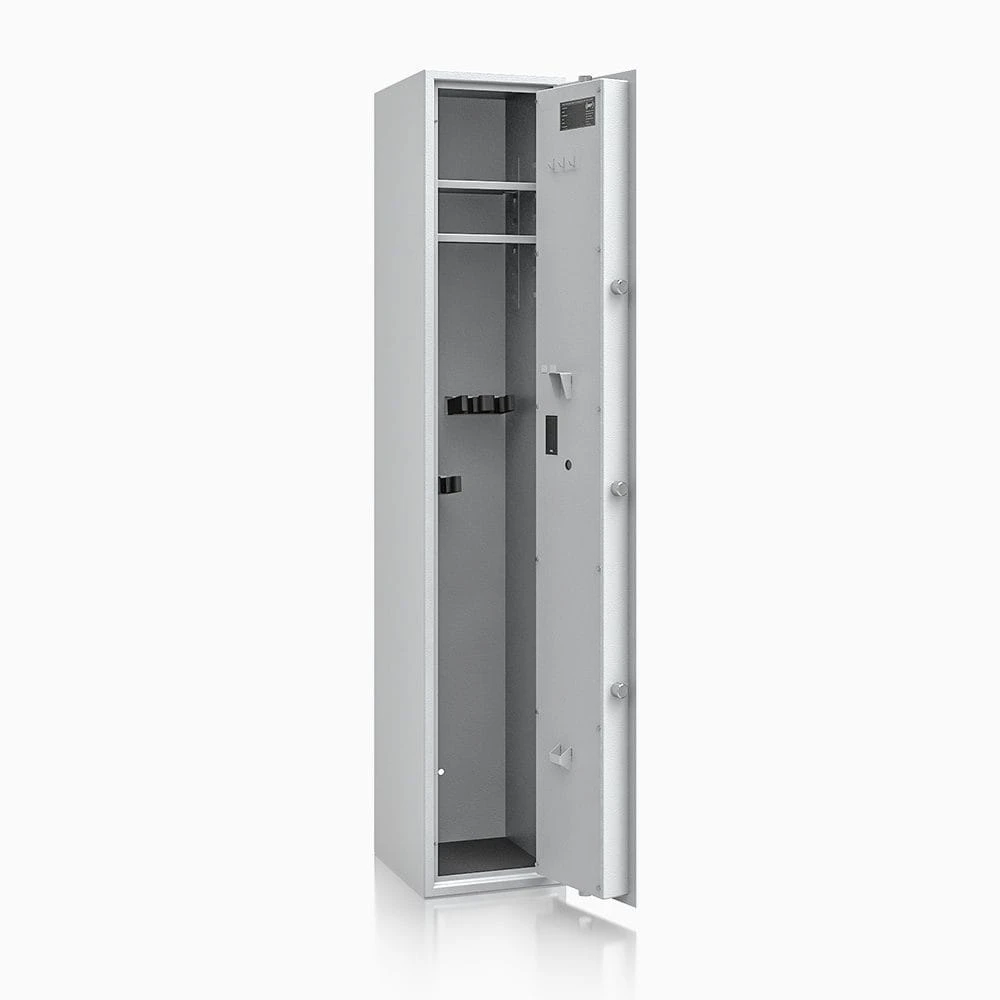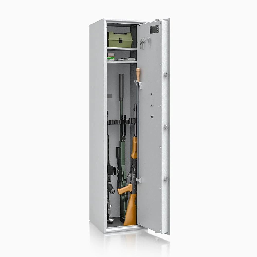 Certyfikowany sejf na broń klasy S1 zgodny z normą PN-EN 14450 . Spełnia wymagania Rozporządzenia MSW z 26.08.2014 r., umożliwiając legalne przechowywanie broni palnej i amunicji . Pojemność do 5 szt. broni , rozbudowane wyposażenie wnętrza oraz możliwość montażu do ściany lub podłoża.