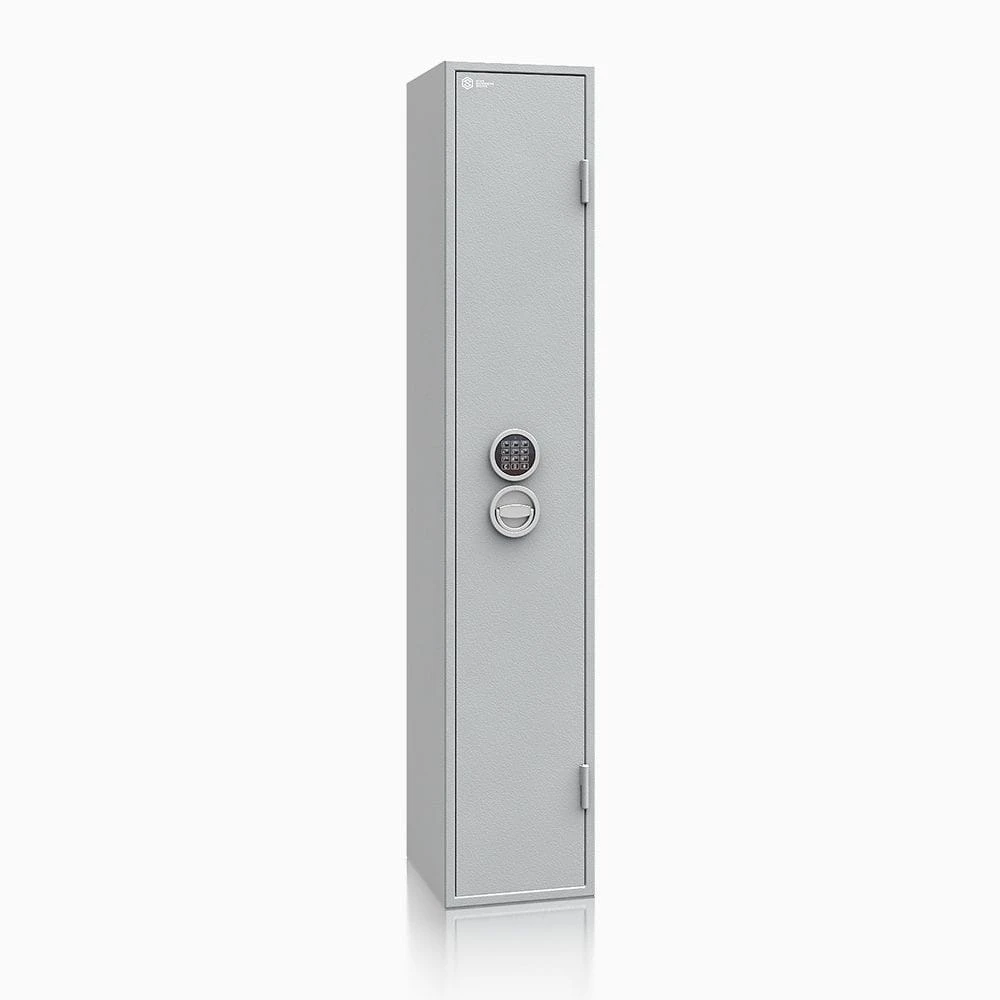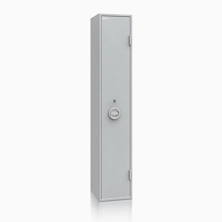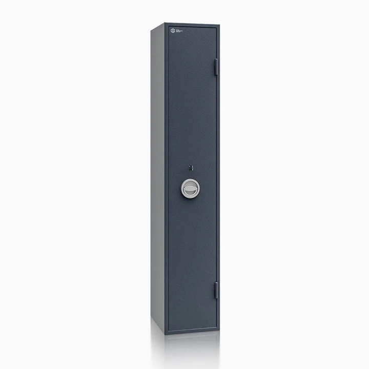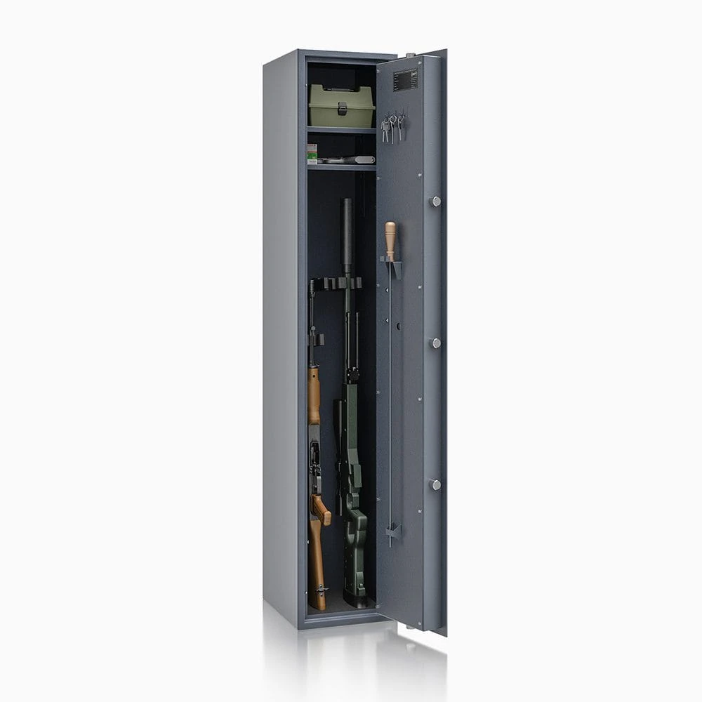 Certyfikowany sejf na broń klasy S1 zgodny z normą PN-EN 14450 . Spełnia wymagania Rozporządzenia MSW z 26.08.2014 r., umożliwiając legalne przechowywanie broni palnej i amunicji . Pojemność do 5 szt. broni , rozbudowane wyposażenie wnętrza oraz możliwość montażu do ściany lub podłoża.