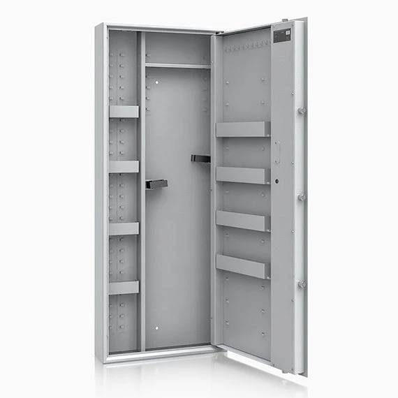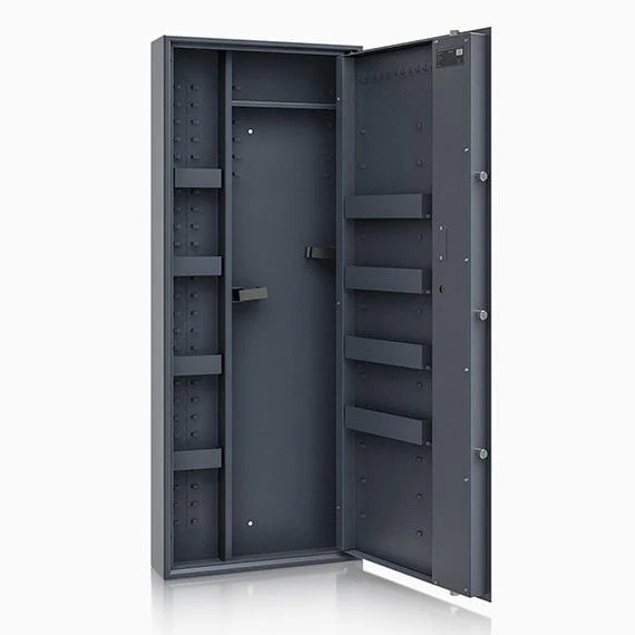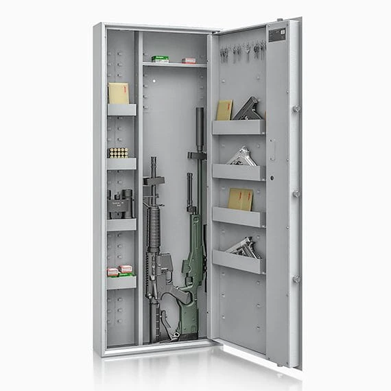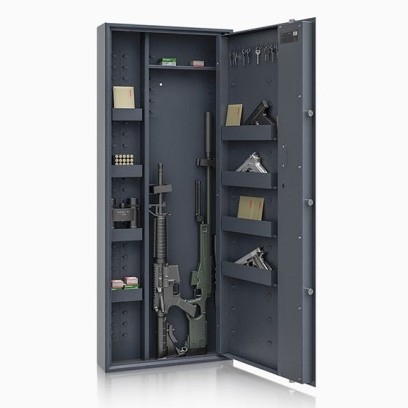 W szafie znajdziesz funkcjonalne pojemniki zawieszone po lewej stronie przegrody oraz miejsce na przechowywanie broni na prawej stronie szafy, co sprawia, że można przechowywać zarówno krótsze, jak i szczególnie długie jednostki broni.
