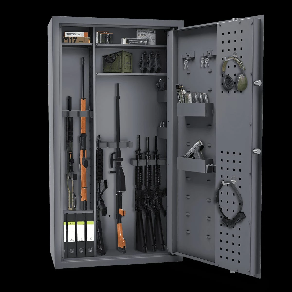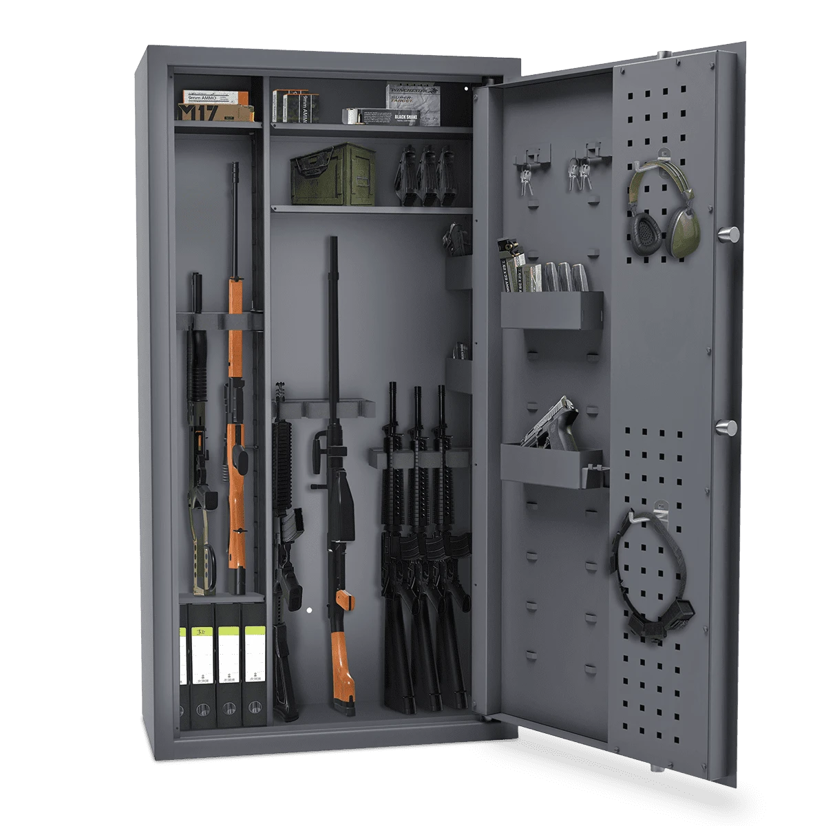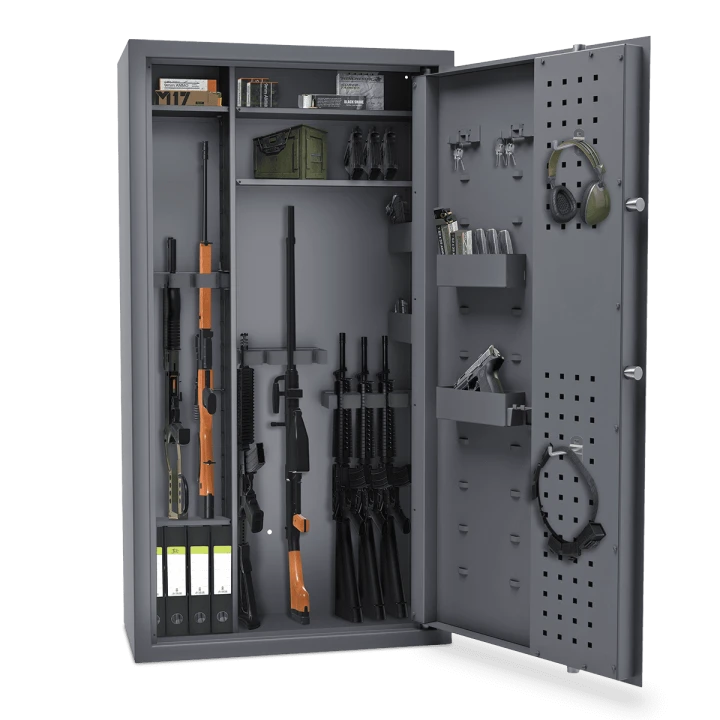 To idealny sejf na broń dla myśliwych, strzelców sportowych i kolekcjonerów, którzy oczekują wysokiego poziomu bezpieczeństwa, nowoczesnego zamka elektronicznego oraz możliwości pełnej personalizacji wnętrza.