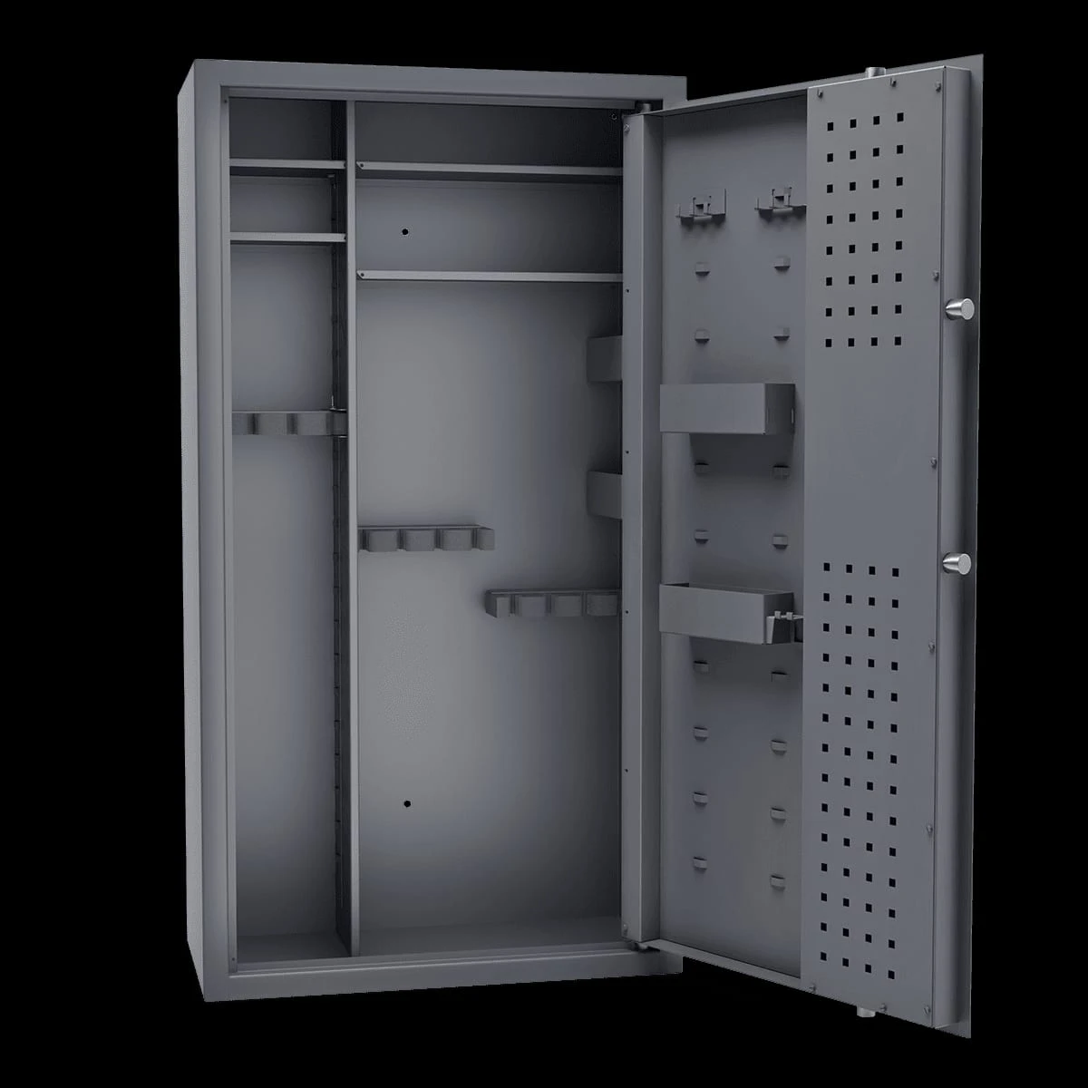 Sejf na broń ARSENAŁ FLEX COMBI 1263 wyposażony jest w system drabinkowy na ścianach bocznych i drzwiach, który umożliwia dowolne rozmieszczenie elementów wyposażenia. Dzięki temu możesz dostosować wnętrze do własnej kolekcji broni oraz akcesoriów.
